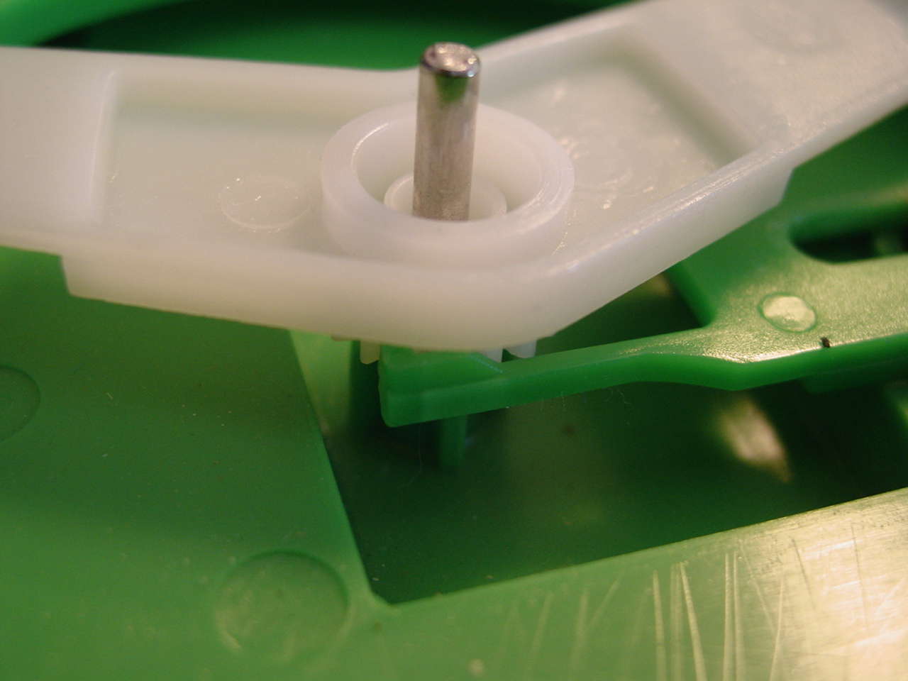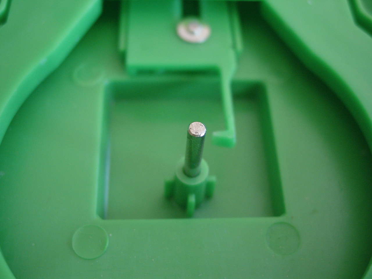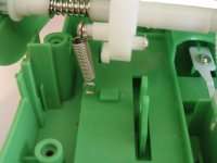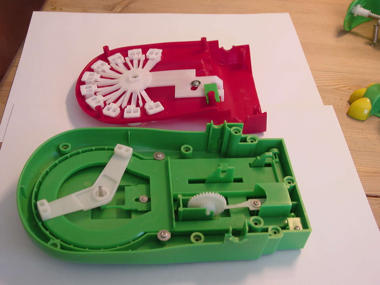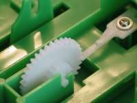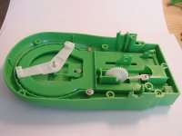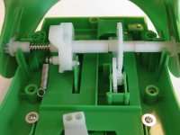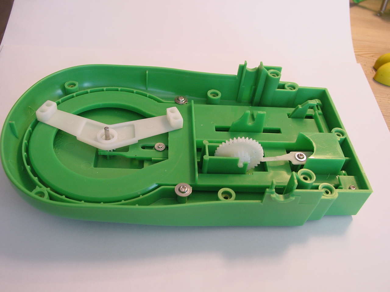 Diese drei Bilder zeigen die gesamte für das Spiel notwendige Mechanik. Im ersten Bild sieht man das Scharnier welches die beiden Teile des Mauls verbindet. Die am oberen Teil befestigte Achse "steuert" alles. Die Feder ganz links wird, wie man im zweiten Bild sieht, in die untere Hälfte des Mauls eingehängt, und gibt die Kraft für das Zuschnappen des Mauls. Das Zahnrad rechts bewegt ein weiteres Zahrand im unteren Teil des Mauls (sihe drittes Bild), welches ein knarrendes Geräusch erzeugt.