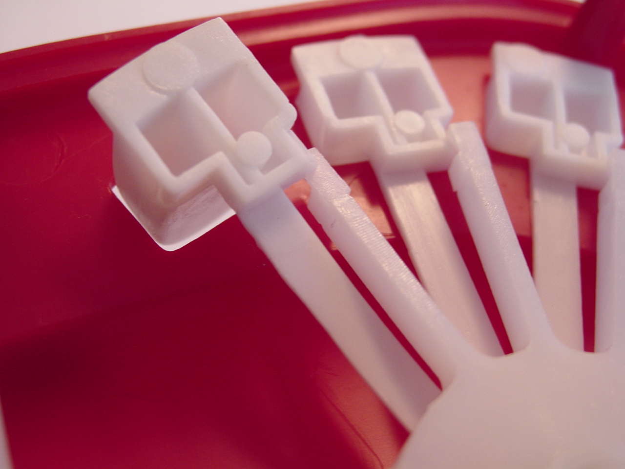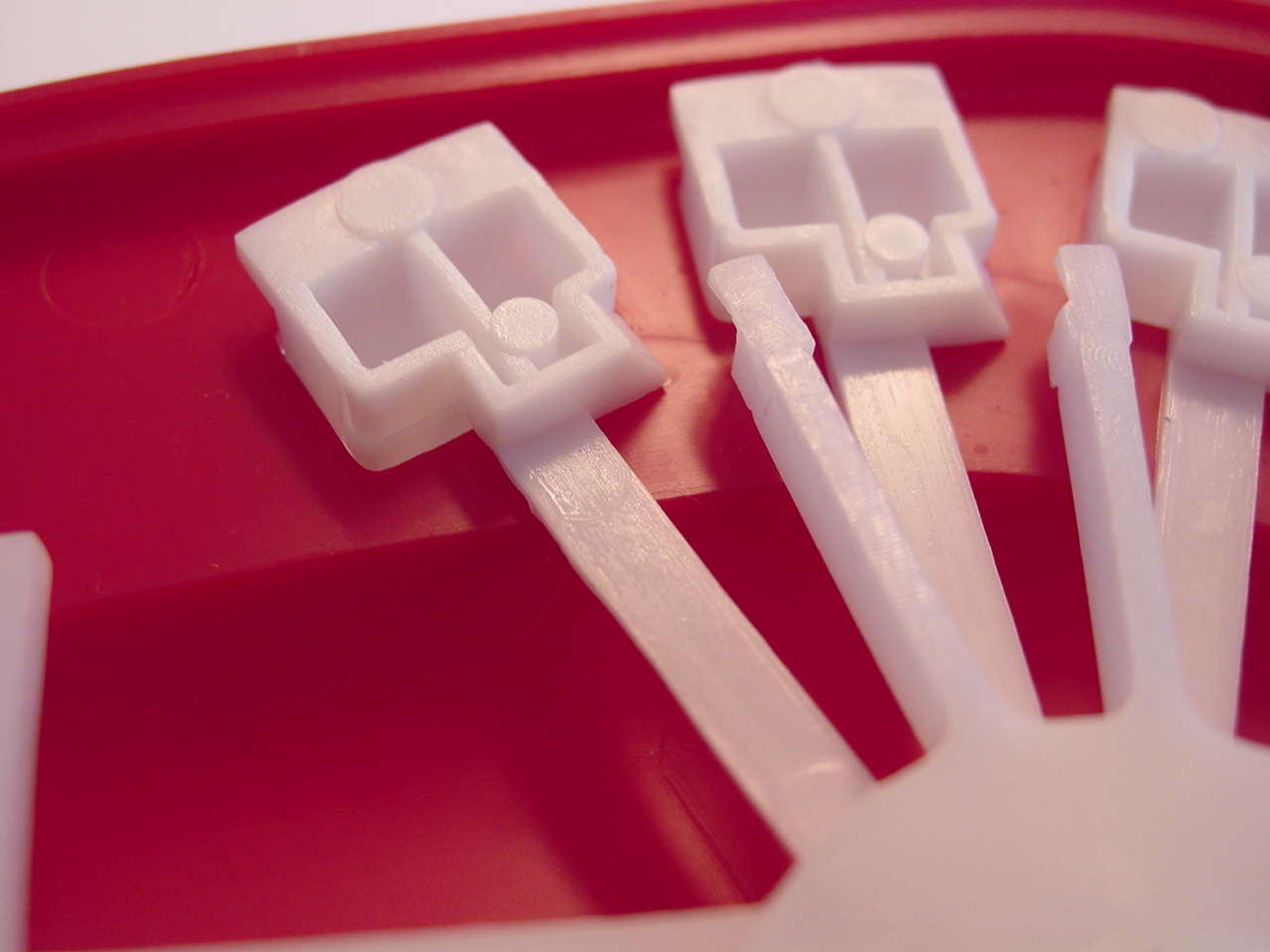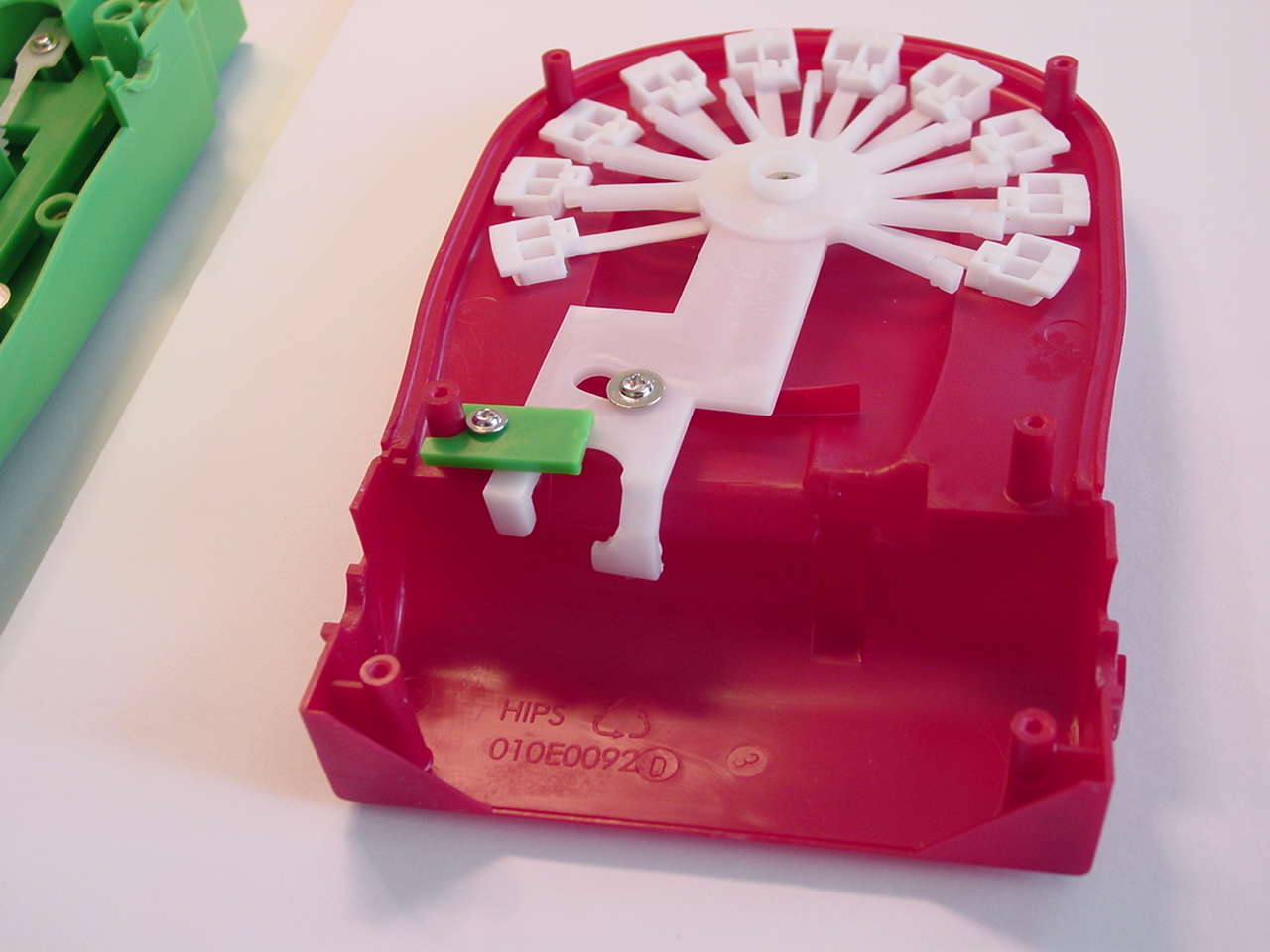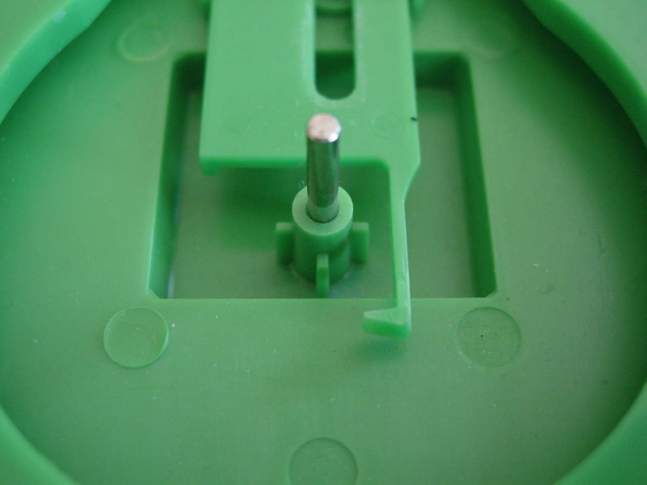 Diese drei Bilder zeigen die gesamte für das Spiel notwendige Mechanik. Im ersten Bild sieht man das Scharnier welches die beiden Teile des Mauls verbindet. Die am oberen Teil befestigte Achse "steuert" alles. Die Feder ganz links wird, wie man im zweiten Bild sieht, in die untere Hälfte des Mauls eingehängt, und gibt die Kraft für das Zuschnappen des Mauls. Das Zahnrad rechts bewegt ein weiteres Zahrand im unteren Teil des Mauls (sihe drittes Bild), welches ein knarrendes Geräusch erzeugt.