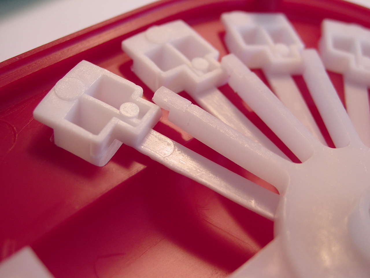 Diese Bilder zeigen nun, wie "Zufall" gemacht wird. Durch die Steuerscheibe wird beim aufmachen des Mauls ein Hebel von Vorne nach Hinten gezogen was man in den ersten beiden Bildern sieht. Wie man im dritten Bild sieht, greift der Hebel in das Zahnrad einen weissen V-förmigen Teils, und bewegt diesen was im vierten und fünften Bild illustriert ist. Was die Bilder leider nicht zeigen ist, dass in dieser Phase das V-förmige Teil nur locker auf der Achse sitzt und ansonsten nicht festgehalten wird. Es rotiert also nicht nur während dem es durch den Hebel aktiv bewegt wird, sonden noch ein kurzes Weilchen weiter, bis das Maul in der offenen Position einrastet, und sich der kreisförge Teil anhebt und das weisse Teil bremst und festhält.